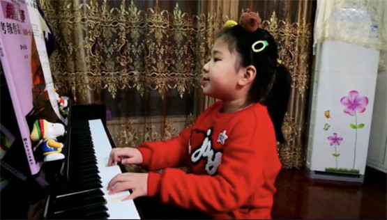 活动当天,不少孩子全家动员布置舞台,家里的墙纸、书柜、窗帘、电视机甚至毛绒玩具都成了舞台背景。演出现场更是精彩纷呈,小小的人儿有的边弹边唱,有的载歌载舞。有的独自上台,有的姐弟同台,也有的全家上场,热闹非凡。